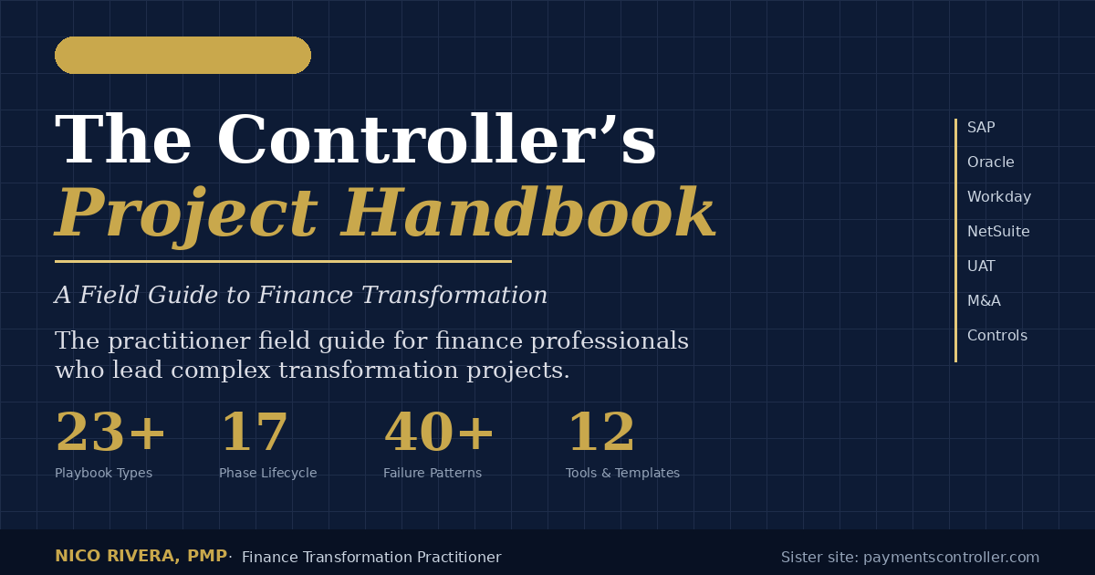 The practitioner handbook for finance professionals who lead complex transformation projects — from scope definition through cutover, stabilization, and the first three closes. Built from real implementation experience in merchant acquiring, payments, and enterprise finance transformation. Not a course. Not a consulting deck. A field guide written from the controller seat.